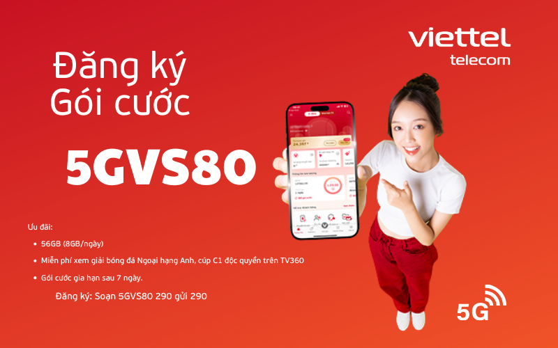 - Gói 5GVS80 Viettel là "cú hat-trick" hoàn hảo: 80K/7 ngày, 56GB data, và xem Ngoại Hạng Anh, cúp C1 miễn phí trên TV360. Fan bóng đá như tôi không thể bỏ qua! Đăng ký liền bằng cách soạn 5GVS80 290 gửi 290 hoặc bấm *098*5128#, rồi chuẩn bị tinh thần "hòa mình" vào các trận cầu đỉnh cao. Mùa bóng đang "cháy", đừng đứng ngoài cuộc – đăng ký ngay hôm nay đi mấy ông!