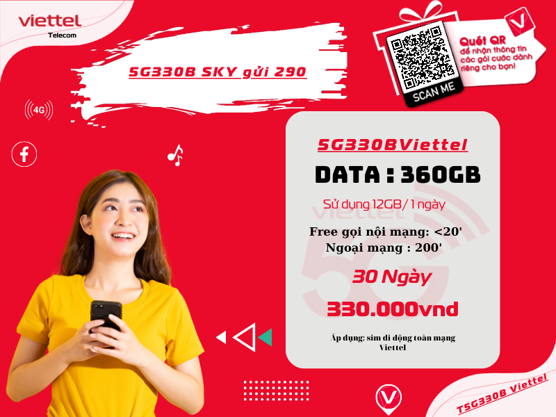 - Áp dụng: Mọi thuê bao di động trả trước Viettel. Bấm https://viettel.vn/ để xem thuê bao của bạn có đăng ký được gói 5G330B Viettel hay không.
